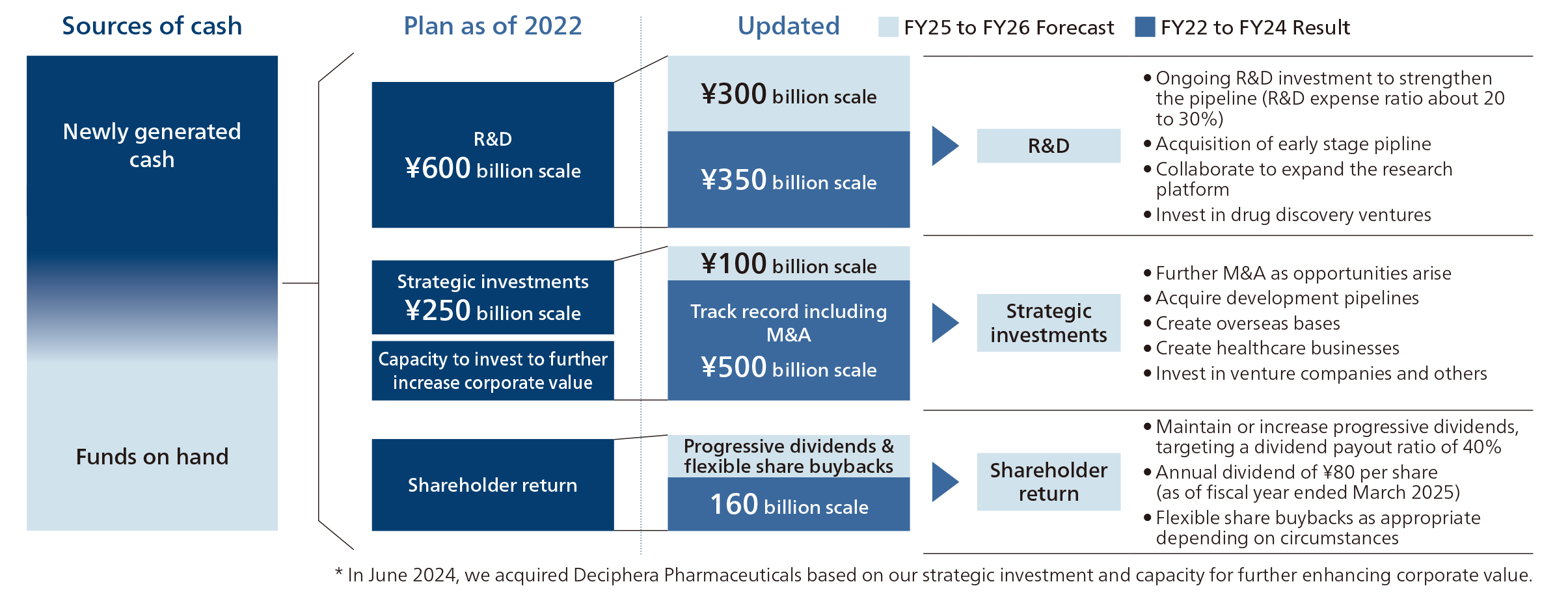 Over the three years from FY2022 to FY2024, Ono Pharmaceutical invested approximately ¥350 billion in R&D expenses and about ¥500 billion in strategic investments. For the next two years, FY2025 to FY2026, we anticipate investing about ¥300 billion in R&D and approximately ¥100 billion in strategic investments such as M&A and pipeline acquisition. These investments prioritize mediumto long-term value creation over securing short-term profit. Our cash allocation policy is to “pursue growth returns that exceed ROIC” and “balance this with financial soundness.” With respect to acquisitions, although the upfront acquisition costs were substantial, in exchange, we have acquired stable, long-term cash flows as well as difficultto-quantify positive elements such as strengthened sales infrastructure, development infrastructure, and R&D capabilities. These enhancements have also contributed to greater negotiating power in global license deals.